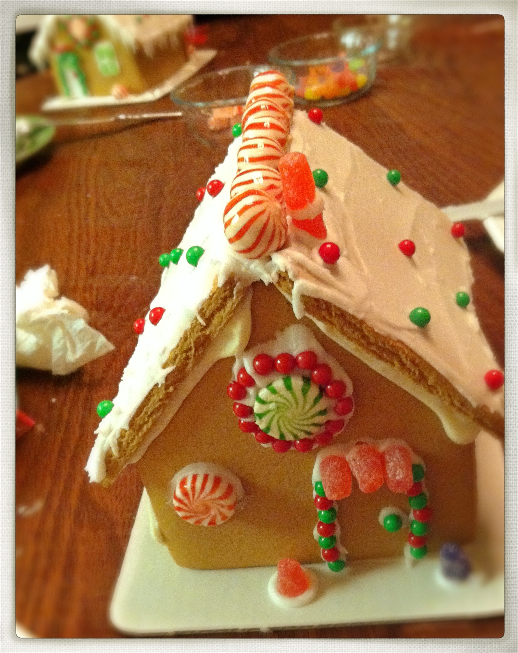 Before you know it, it is Christmas tradition time! Poof, three months has flown by! This year for the first time, the kid’s gingerbread houses don’t look like a candy/frosting factory puked on them. This is the first year they both decided to follow some suggested ideas in the directions! I was both impressed and sad to be honest. I was impressed with how well their houses came out (one is in the background, but you can still see it, lovely icicles!) But I was sad to know their childish glops of frosting and uneven gum drops were days of the past now. It has spurred a field trip. We are going to go check out a bakery that makes professional gingerbread houses and see how they do their amazing decorating tricks.