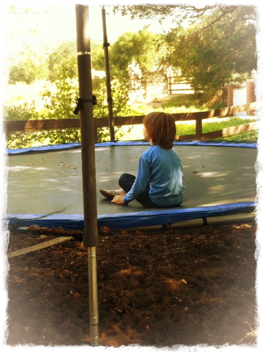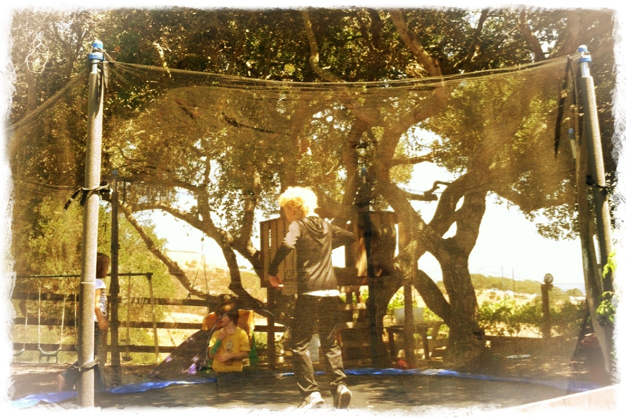 Little break to jump on the trampoline (and it is hard to see but one kiddo is up in the tree)